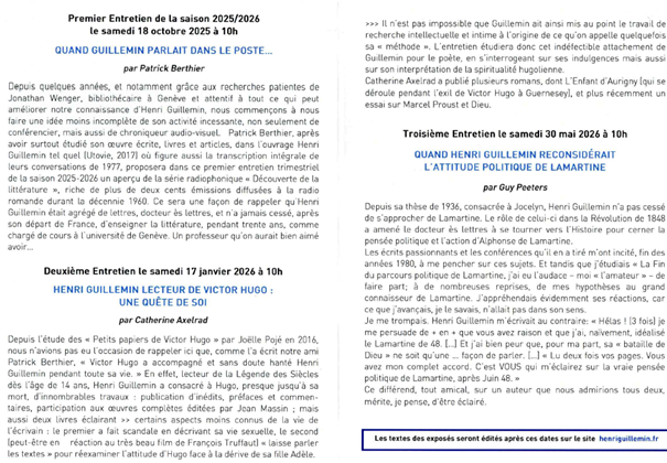 Programme 2025-2026 des Entretiens Henri Guillemin et conférence de Patrick Berthier le 18 octobre